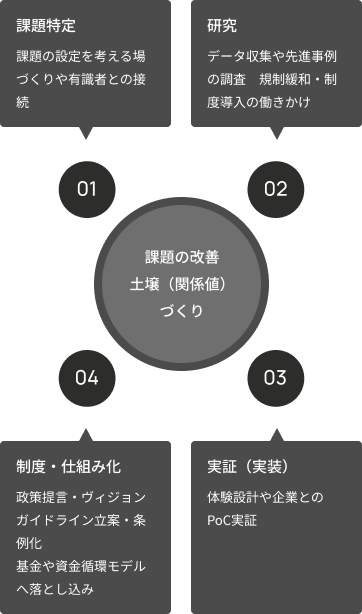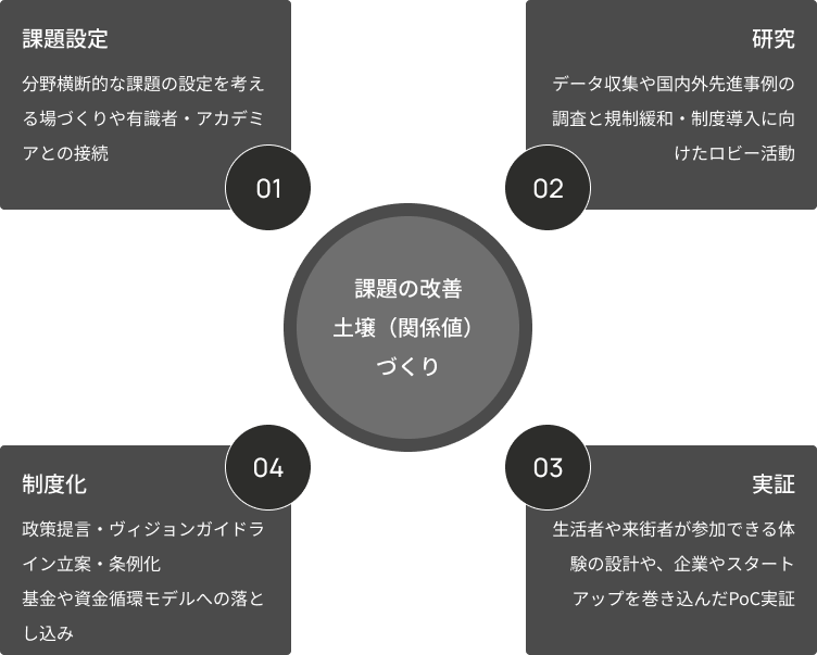 「地域との関係値を起点に「課題設定 × 研究 × 実証 × 制度化」のサイクルで活動しています。プロジェクトなどの実践を通じて課題を見出し、検証を重ねながら社会に実装。実践的で継続的な取り組みを通じて渋谷ならではの価値の創出を目指しています。